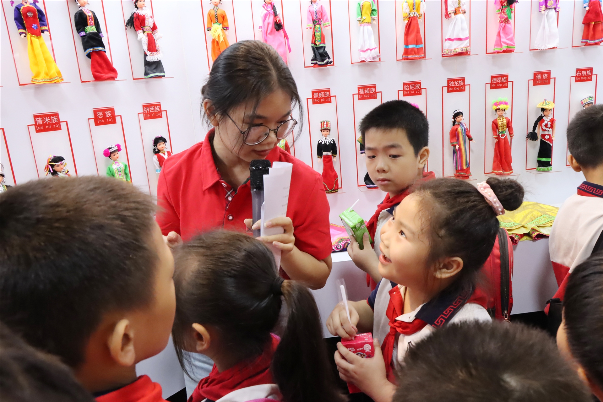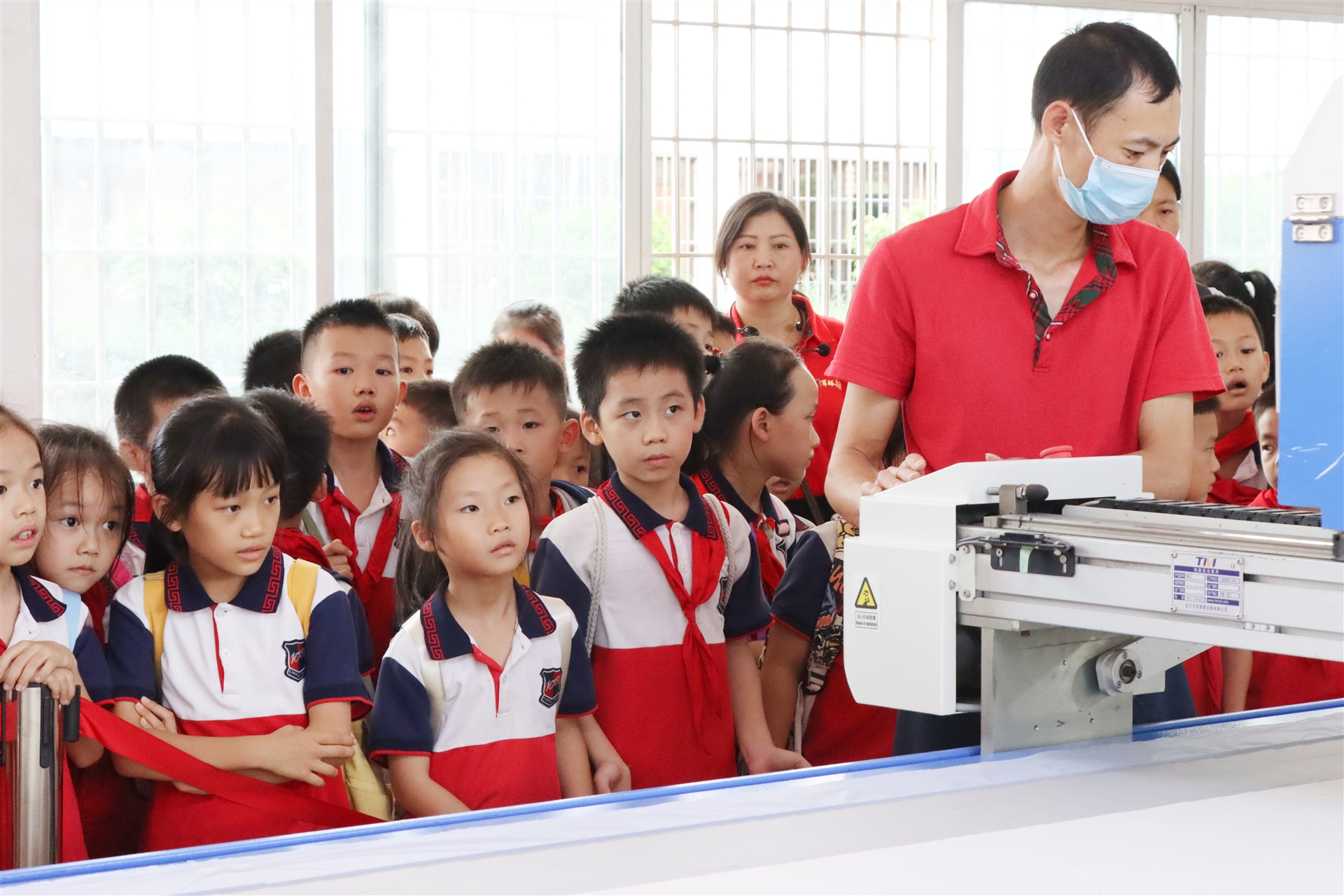 在講解員的引導(dǎo)下,孩子們走進校服展示廳,了解校服的產(chǎn)生和歷史變遷,還參觀了解了校服的服飾面料、款式、紋樣以及背后蘊藏的服飾文化。通過近距離觀察不同民族的服飾和傳統(tǒng)老式縫紉機、織布機,他們不僅感受到了校服文化在歷史長河中的變遷及其魅力,也增強了學(xué)生的校服文化自信。