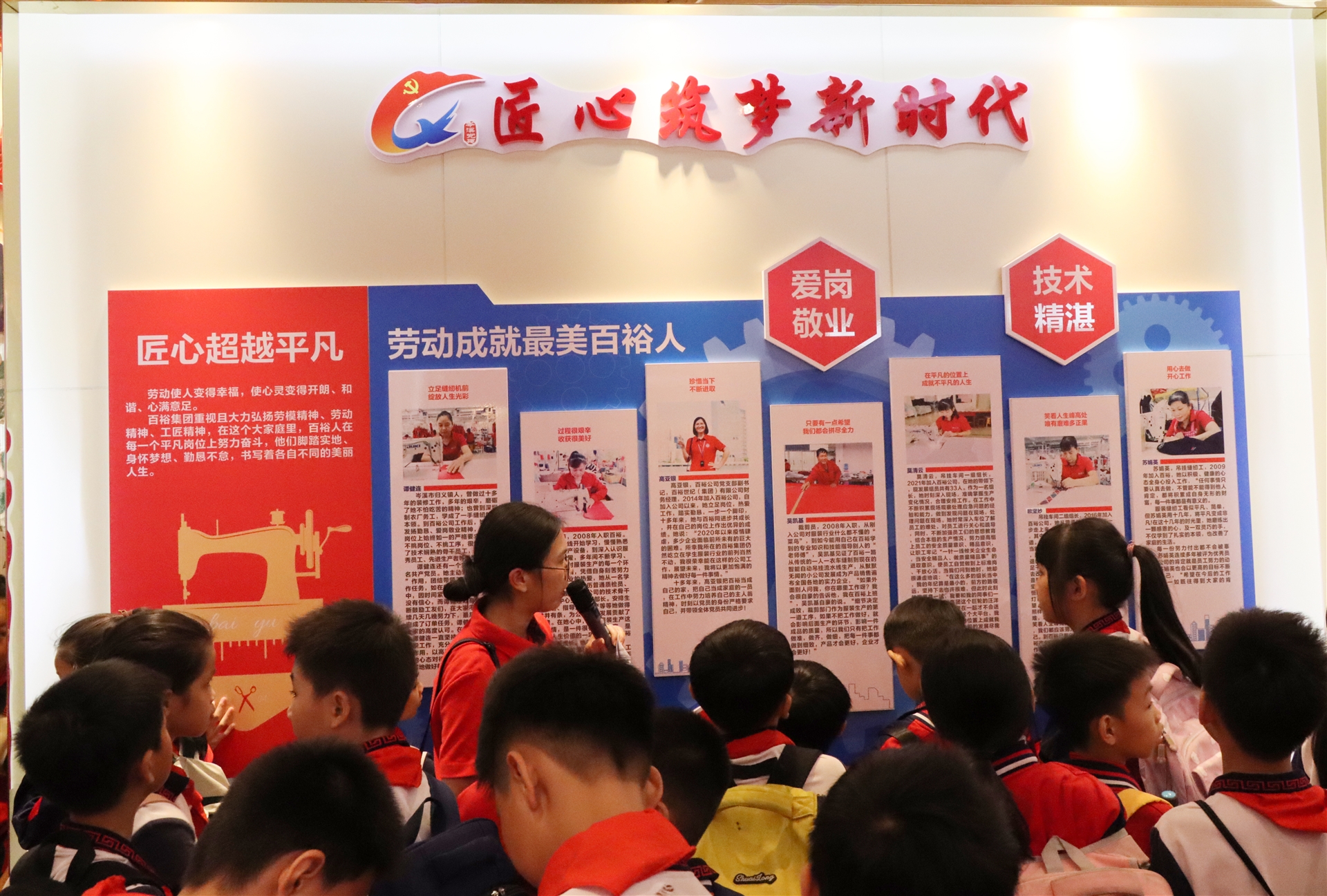 孩子們走進了百裕集團黨建中心,了解到了百裕集團的發(fā)展歷程、取得的成績及榮譽。接著還到“五一勞動獎?wù)隆薄⒓寄艽筚愐坏泉労汀吧磉呑蠲傈h員”稱號獲得者的相關(guān)工位,聆聽了他們的故事,學(xué)習(xí)到了偉大的工匠精神。