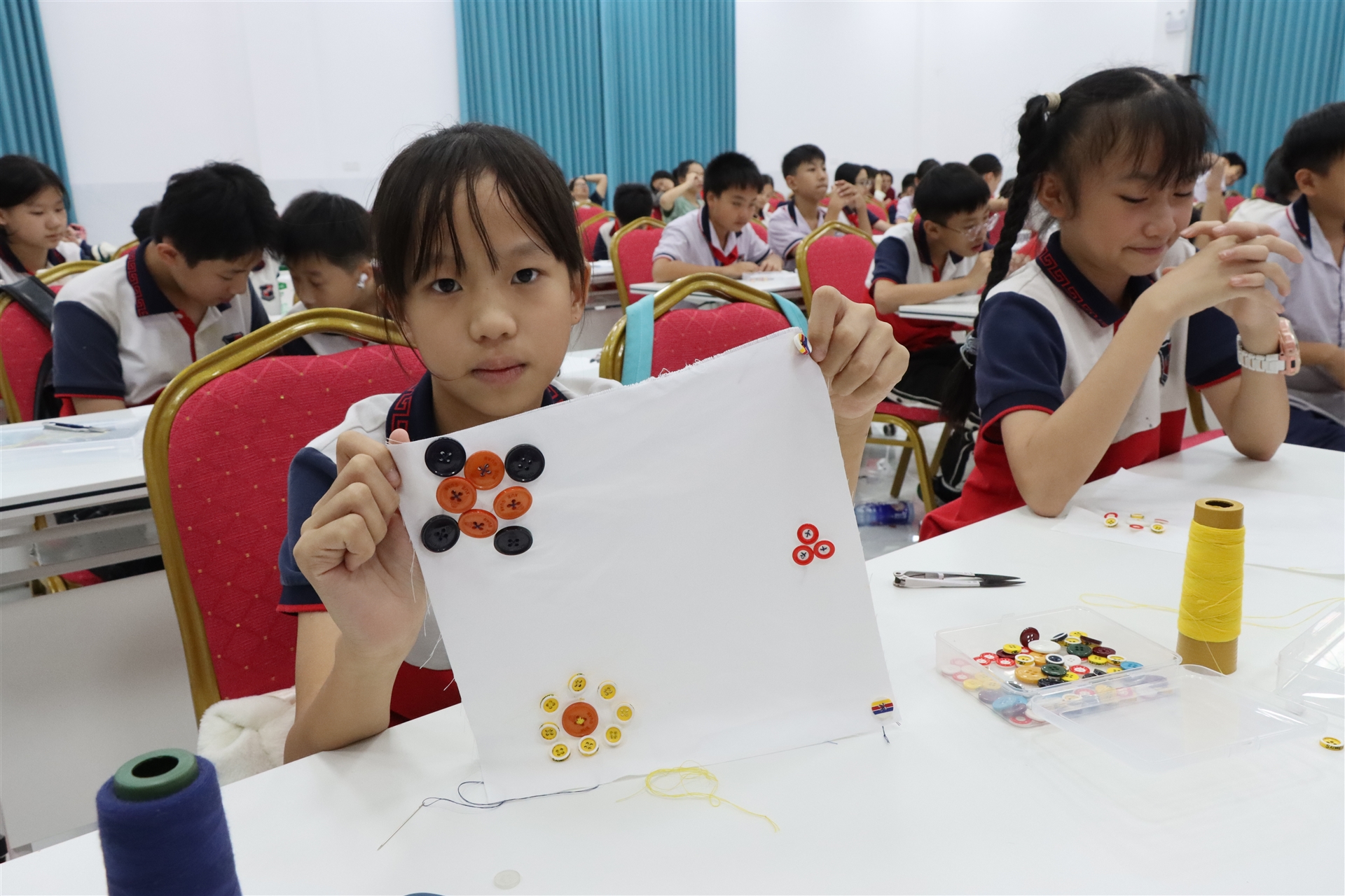 孩子們還體驗了一場別開生面的服飾小制作,領(lǐng)略了制作之美。在老師的指導(dǎo)下,學(xué)生們首先了解紐扣的基本構(gòu)造和縫制紐扣的步驟要領(lǐng),之后再自己動手做“針線活”,用略顯稚嫩的小手把扣子穿牢固定,還發(fā)揮了自己的想象力,把不同的扣子組合拼接,形成一幅幅生動的花朵“畫作”。