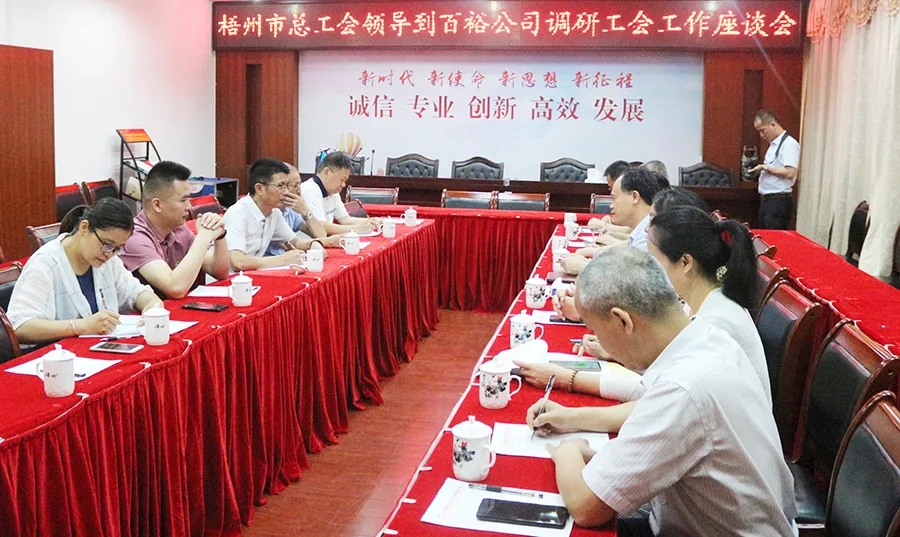 5月18日,梧州市總工會黨組書記、常務副主席謝善高、辦公室主任陳潔萍、勞經(jīng)部部長呂星等領導蒞臨百裕調研指導,重點了解基層工會建設情況、運轉情況以及勞模創(chuàng)新工作等方面的工作情況。岑溪市人大副主任、工會主席謝梅、百裕世紀工會主席曾晏來陪同調研。