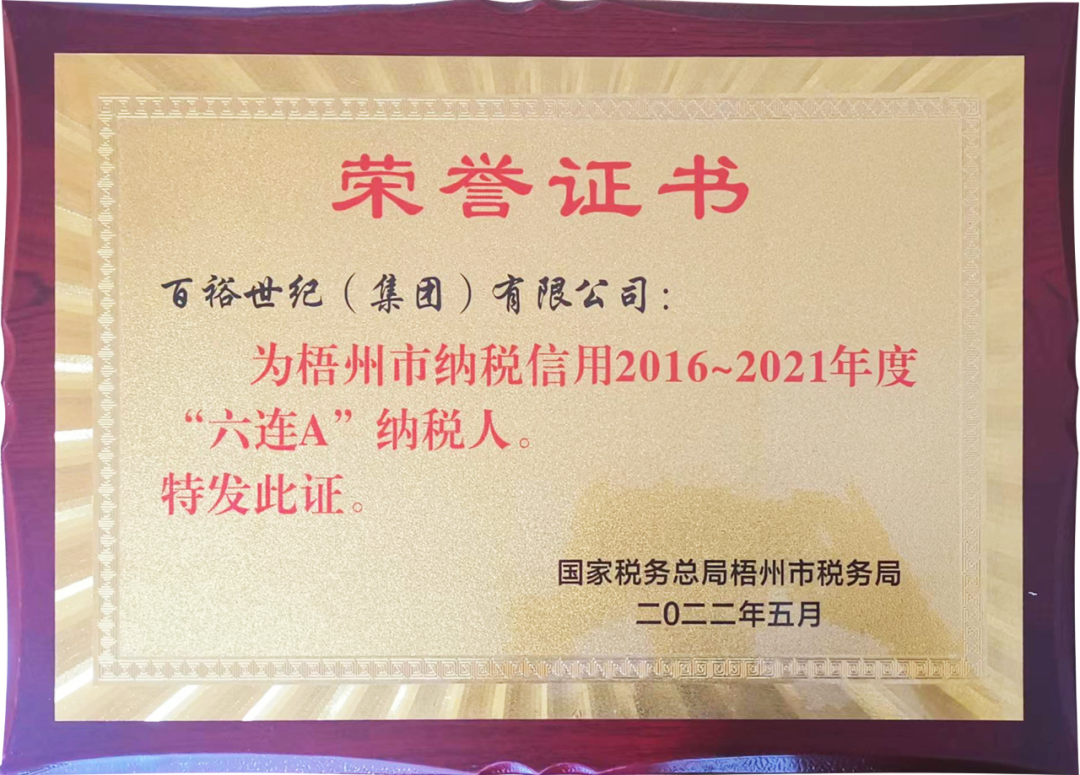 近日,經(jīng)國家稅務(wù)總局梧州市稅務(wù)局評審,百裕世紀(集團)有限公司被評為2016~2021年度“六連A”納稅人,這是我們堅持依法、誠信經(jīng)營的實質(zhì)成果。