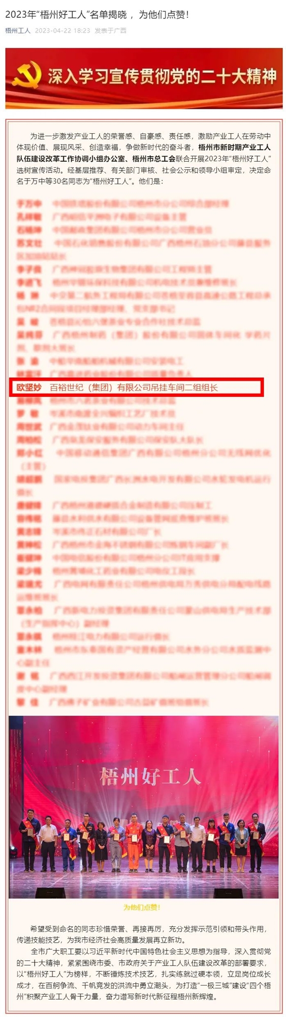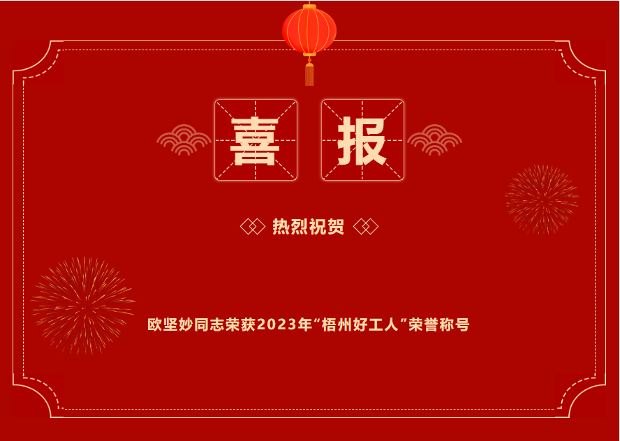 喜報(bào) | 百裕世紀(jì)(集團(tuán))歐堅(jiān)妙同志 榮獲2023年“梧州好工人”稱號(hào)
