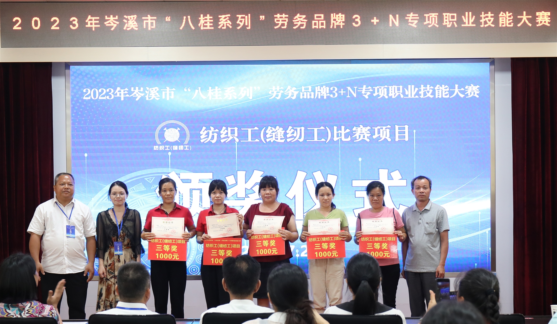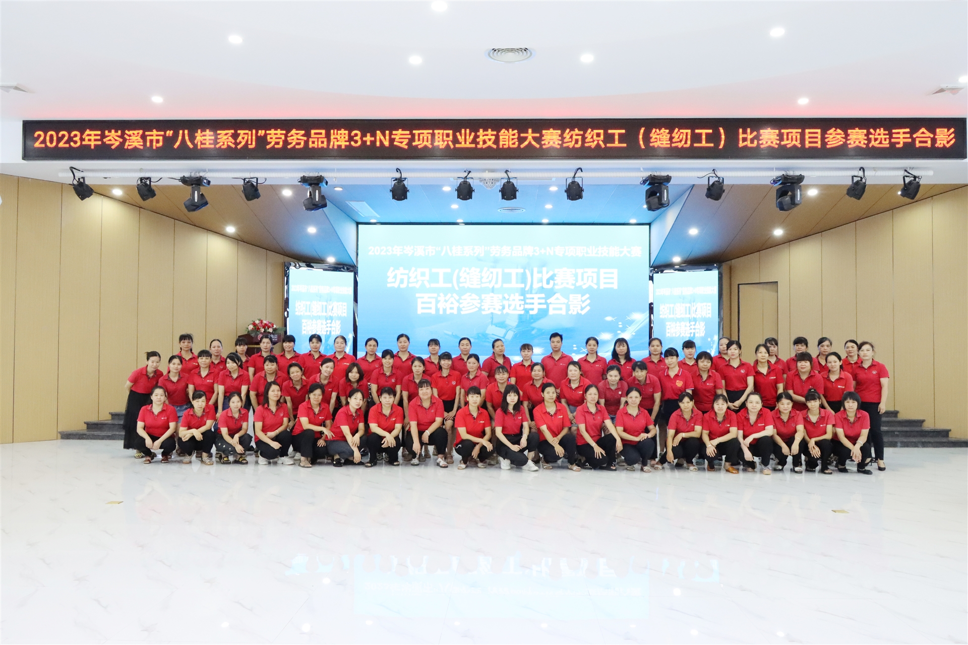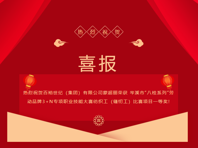 百裕世紀 (集團)有限公司線下車間職工超麗榮獲紡織工 (縫工)比賽項目的一等獎;羅婷婷、陳杏娟2位職工榮獲二等獎;梁鳳、羅獻鳳、覃廣英、莫清云、廖芬藝5位職工榮獲三等獎;陳海蘭、陳志平、張紅潔等12名職工榮獲優(yōu)勝獎。