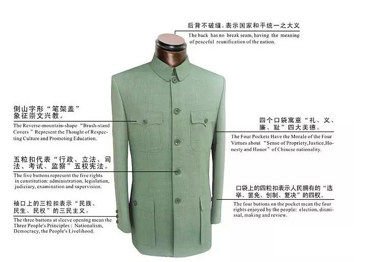 前襟的五粒紐扣和五個(gè)口袋(一個(gè)在內(nèi)側(cè))分別表示孫中山先生的五權(quán)憲法學(xué)說(shuō)(行政權(quán)、立法權(quán)、司法權(quán)、考試權(quán),還有監(jiān)察權(quán)在領(lǐng)口(紐扣)和內(nèi)側(cè)(口袋),以彰顯監(jiān)察權(quán)的人民監(jiān)督作用);