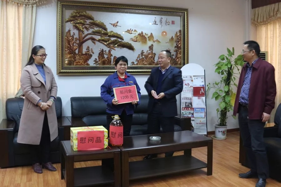 企業(yè)的發(fā)展離不開基層職工的辛勤付出,同月29日,廣西梧州市百裕實(shí)業(yè)有限公司常務(wù)副總經(jīng)理謝移植、岑溪生產(chǎn)廠廠長(zhǎng)王平志一行先后走訪黃旭群等困難職工,為職工們送去春節(jié)禮品,并轉(zhuǎn)達(dá)了公司對(duì)職工的深切問(wèn)候和美好祝福。