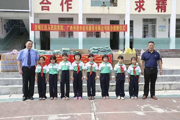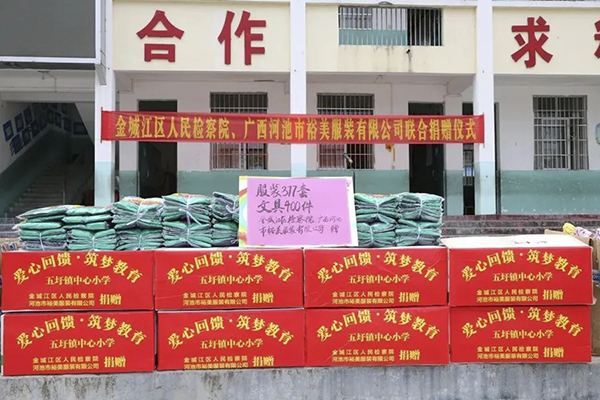 此次活動(dòng),金城江區(qū)人民檢察院為五圩鎮(zhèn)中心小學(xué)捐贈(zèng)共計(jì)價(jià)值8000余元的400套學(xué)生文具,百裕集團(tuán)為五圩鎮(zhèn)中心小學(xué)捐贈(zèng)共計(jì)377套價(jià)值33930元學(xué)生校服。